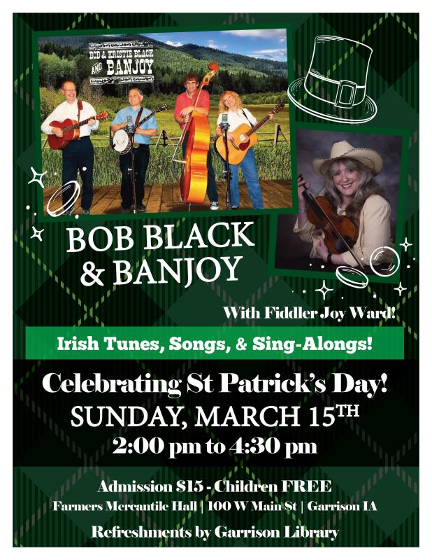 Bob Black and Banjoy will be in Garrison to celebrate St Patrick's Day, Bluegrass style, with some lively Irish tunes, songs and sing-alongs, featuring Joy Ward on the fiddle! Be ready for some great ...