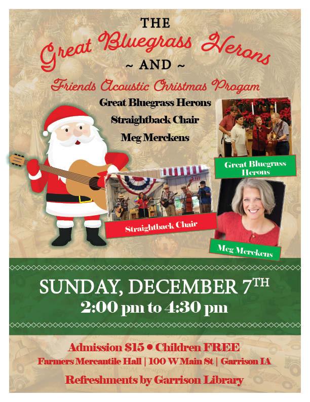 The Great Bluegrass Herons & Friends Acoustic Christmas Program is the perfect way to celebrate the Christmas season! Join us for a Sunday afternoon of songs and stories of the season. Performers will include the Great Bluegrass Herons, Straightback Chair and Meg Merckens. These shows are wonderful! See you there!