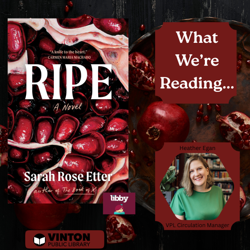 'Ripe' by Sarah Rose Etter is my latest dystopian find on the Libby App. Cassie has moved to Silicon Valley to work for a start-up that promised her the world on a silver platter, but instead leaves her working days, nights, and weekends for barely enough pay to survive. What is strange and striking about 'Ripe' is the presence of a black hole that has followed Cassie since childhood—beginning with her strained relationship with her mother. The black hole is like an invisible, sinister companion; it ebbs and shifts with her, sometimes vibrating close enough to sing a hymn.