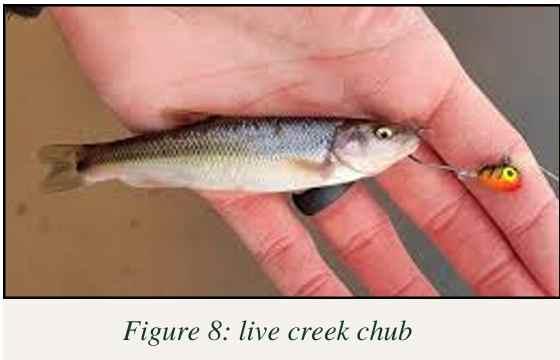 A jig paired with a chub is one of the most controlled and versatile methods for working river structure. I prefer using 1/8" to 1/4” oz jig head depending on current. The key is to roll, and tumble the bait naturally along seams and eddies. Lighter jigs help maintain subtle, lifelike action that mirrors a struggling baitfish often triggering aggressive strikes. Hook placement and presentation strategy can be the difference in catching fish all day and going home empty handed. Nose-hooking or hooking the chub lightly through both lips keeps it lively and allows for a natural, forward-swimming presentation. This method is best for slip sinker rigs, slip bobbers in slow to moderate current conditions. Tail-hooking is placing the hook near the tail, just below the dorsal fin which induces erratic swimming motions that can trigger reaction strikes. Light jig presents situations where fish are inactive; a tail-hooked chub will put off more vibration and struggle, appealing to walleye feeding on distressed prey. Deep holes, outside bends and channel edges with reduced current or rock riffles and bottom transitions that funnel bait are areas that concentrate forage and offer ambush opportunities for walleye, making them ideal for chub-based presentations.