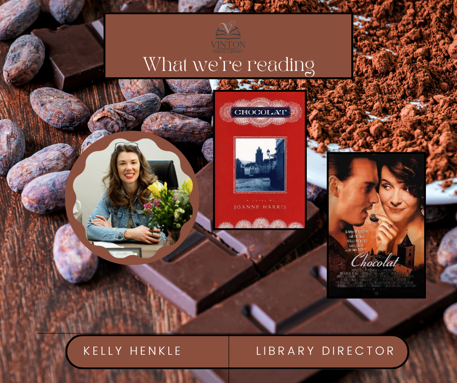 I'm currently reading 'Chocolat,' the 1998 novel by Joanne Harris about Vianne Rocher, a woman who moves into a rural French community with her young daughter and opens a chocolate shop during Lent. It inspired the 2000 film starring Juliette Binoche and Johnny Depp, which was nominated for five Academy Awards including Best Picture.