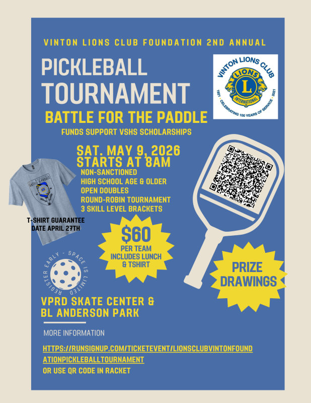 Save the Date! The Vinton Lions Club Foundation (VLCF) will host the Second Annual Pickleball Tournament, “Battle for the Paddle,” on Saturday, May 9, beginning at 8:00 a.m. Funds raised will support scholarships for Vinton-Shellsburg High School students.