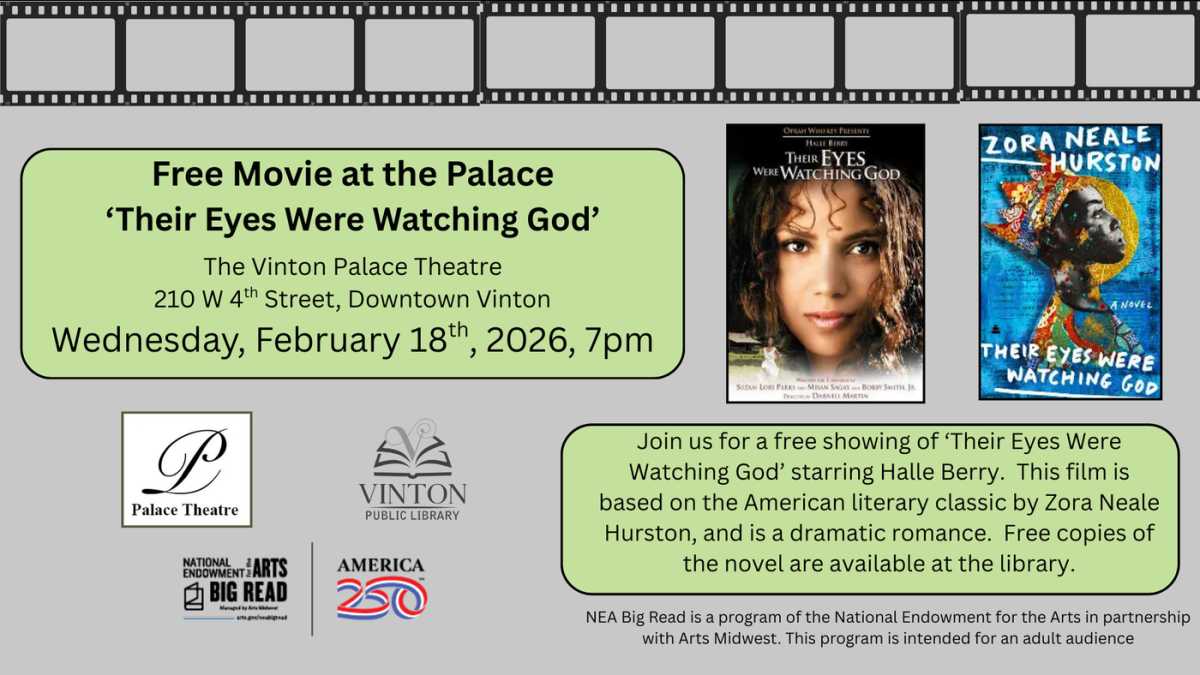 Join us for a free showing of 'Their Eyes Were Watching God' starring Halle Berry. This film is based on the American literary classic by Zora Neale Hurston, and is a dramatic romance. A limited number of free copies of the novel are available at the library, along with copies available for checkout.