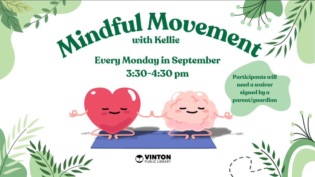 Join us for Mindful Movement with Kellie! This event is for kids, and a parental waiver is required. Email kroberts@vintonia.gov for more information: