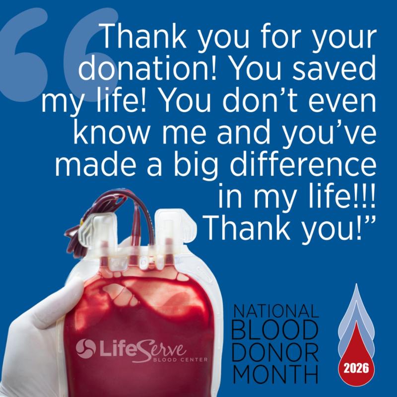 Join us this month in donating blood at the January 23, 2026 blood drive!  From 11:45 a.m. until 3:30 p.m. a clinic will be set up at Virginia Gay Hospital in the Conference Room.
