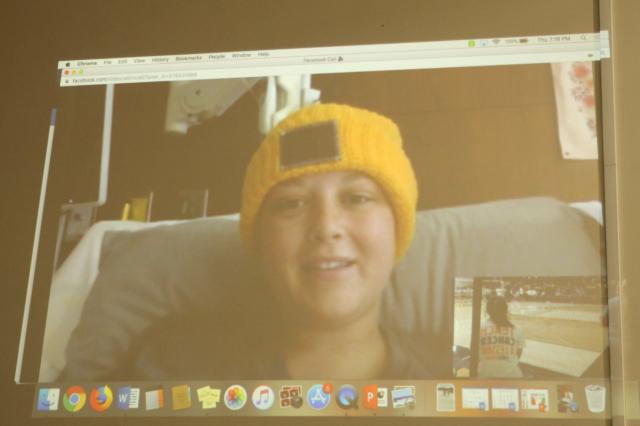 Then, as the lights went down, Carly Meyer appeared on the Fieldhouse wall, live via video chat from her hospital room in Iowa City. With a big smile she thanked the crowd for their support.