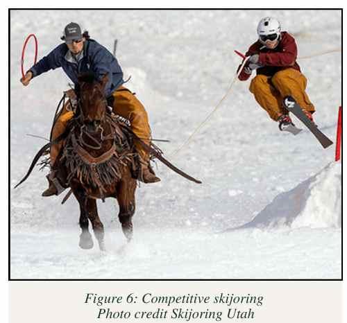 If you and a friend have a competitive streak, you can step things up and enter a skijoring event! These courses feature jumps, obstacles, and hoops to grab while being towed by your friend on a horse at a full gallop (figure 6). Spectators come from all over to brave the cold and watch the competitions. Events are timed with some races having $15,000 in prize money!