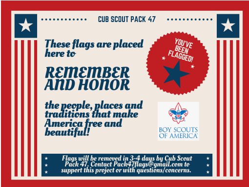 Cub Scout Pack 47 would love to show and spread patriotism as a community. We are holding our third annual "You've Been Flagged" fundraiser. For $80 per year the cub scouts will place and remove 21 American Flags in each yard for Memorial Day, 4th of July, Labor Day and Veterans Day.