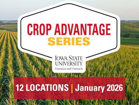 The 2026 Crop Advantage Series will take place at 12 locations across the state Jan. 6–29. Each meeting will feature tailored topics selected based on local growing conditions and challenges, presented by Iowa State University Extension and Outreach specialists.