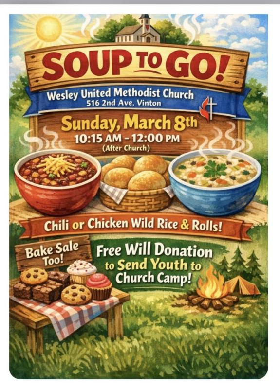 It may be short, but it is big on fun!Join us in downtown Dysart for Iowa’s Shortest St. Patrick’s Day Parade on March 17th at noon, organized by Mayor Tim Glenn.It’s quick, festive, and a fun c... Wesley United Methodist Church - Soup-To-Go meal, Sunday, March 8th