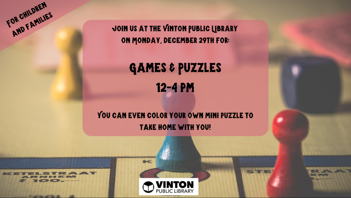 Join us for a fun time at the Library on Monday, December 29, bring the whole family! We will be playing games and getting out the puzzles from noon until 4:00 p.m.