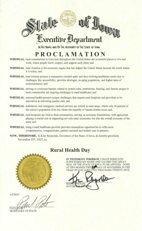 This year, Iowa HHS is marking the occasion by Governor Kim Reynolds proclaiming today, November 20th, 2025 as Rural Health Day.