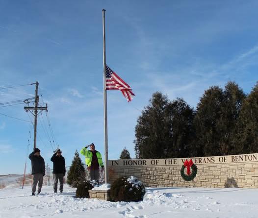 Veteran members of the Benton County American Legion lowered the flag at their memorial along Highway 30. The Benton County Memorial flag was lowered to half mast to honor the Iowa National Guard members killed in action in Syria, Sgt. Edgar Brian Torres Tovar, 25, of Des Moines, and Sgt. William Nathaniel Howard, 29, of Marshalltown. Three other service members were injured during the incident in Palmyra, Syria. The soldiers were part of the 2nd Brigade Combat Team, 34th Infantry Division.