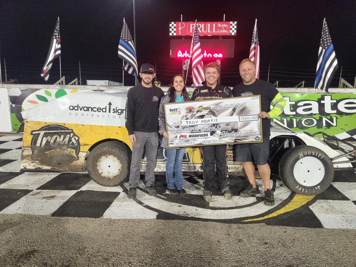 Troy Morris III took the Modified win. Morris whose pole quickly expanded his lead over Shane Paris and Joel Rust. The trio began to pull away from the field and into lapped traffic early in the event. Rust moved into second as Jeff Aikey worked around Paris for third. Morris distanced himself from Rust as the laps clicked away. Morris took the checkers first, Rust, Aikey and Paris followed.