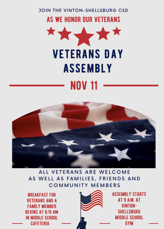 Join the Vinton-Shellsburg Community School District as we honor our Veterans. The Veterans Day Assembly will be held on Tuesday, November 11 at the Vinton-Shellsburg Middle School Gym. Veterans and ... Veterans Holiday Parade November 20, 6:00 p.m.