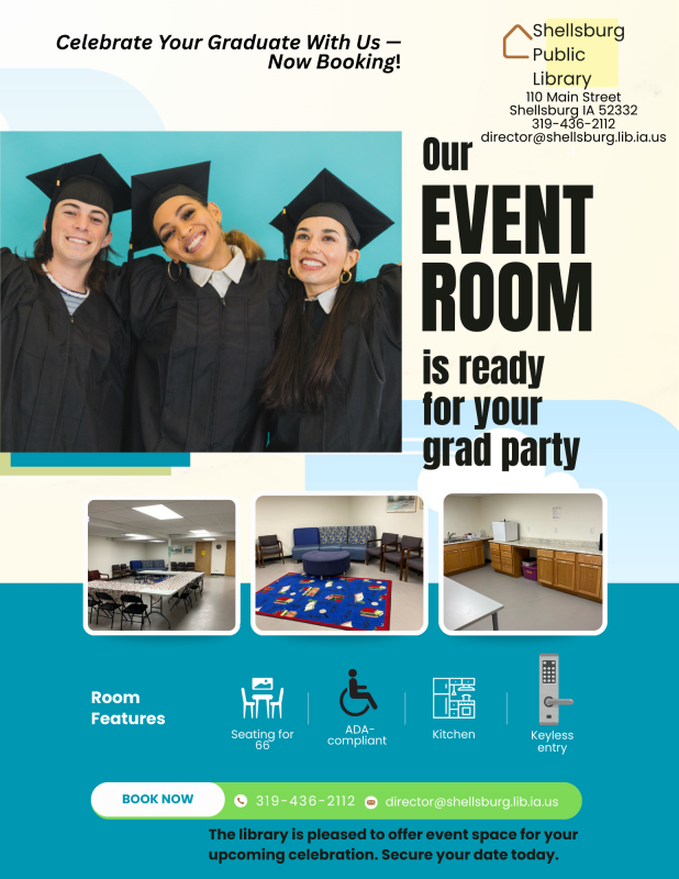 Celebrate your graduate with us. Shellsburg Public Library has an event room waiting for your grad party and much more. We have seating for 66, ADA compliant, kitchen and a keyless e... Happy Presidents' Day!