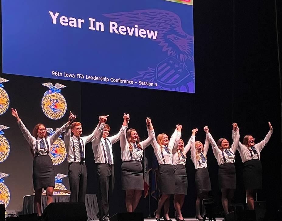 From April 14th through April 16th, the Vinton-Shellsburg FFA Chapter went to the 96th Annual State FFA Leadership Conference. V-S FFA had over 50 members who went to the conference to participate in numerous contests! All of the members worked extremely hard to prepare for the State Convention, by putting in many hours into applications and practices. On Sunday, the day started by loading up the vans and bus before heading for Ames. As soon as members got to the hotel, they got back on the bus and headed to the Hilton Coliseum to package meals for “Meal from the Heartland”. All of the meals packaged will be sent out all over the country to help feed hungry people. Afterward, the chapter headed back to the hotel and practiced for upcoming contests. On Monday, members all got up bright and early to get fueled for the day. Three members participated in Courtesy Corps, Alana Fleming and Andrew Pingenot received their proficiency awards on stage, Annabelle Newton gave her retiring address as a State Officer talking about “Embracing Every Era”, Jerry Lee accepted the chapter’s Ambassador Award, and then three of the chapter’s LDEs were recognized on stage, where they all received 1st Place!! Throughout the day, members had the opportunity to visit the career and college show, enjoy sessions, and watch various competitive events. Following the day, all of our members enjoyed a pizza party sponsored by the Vinton-Shellsburg FFA Alumni & Supporters Chapter before they got to work preparing for the next day’s events and contests! On the second day, members got another early start to their contests. Andrew Pingenot was recognized for serving on the POA Committee, Juliana Luis carried the chapter’s flag during the Grand Ceremony, and Ciara Dods received 1st place winning the Greenhand Quiz Competition! Annabelle Newton recognized her parents on stage for their loving support and endless effort towards her year of service as a state officer and we heard band members Rachel Rollinger, Sam Lundvall, Brody Waters, and Kara Rollinger. Then members Megan Schlitter, Grayce McClintock, Jerry Lee, and Austin Noe all received their Iowa Degrees and for the final time, Annabelle Newton hung up her jacket as the NE State Vice-President. All in all, members had a great convention filled with so many memories and inspiration to continue on their mission to Go Beyond in FFA! Thank you to the awesome chaperones that spent many hours keeping everyone going, the Alumni and Supporters Chapter for their sponsorship, and the advisors for keeping us on time, in-line, well-fed, and positive! Here is an all-inclusive list of the results from State Convention: