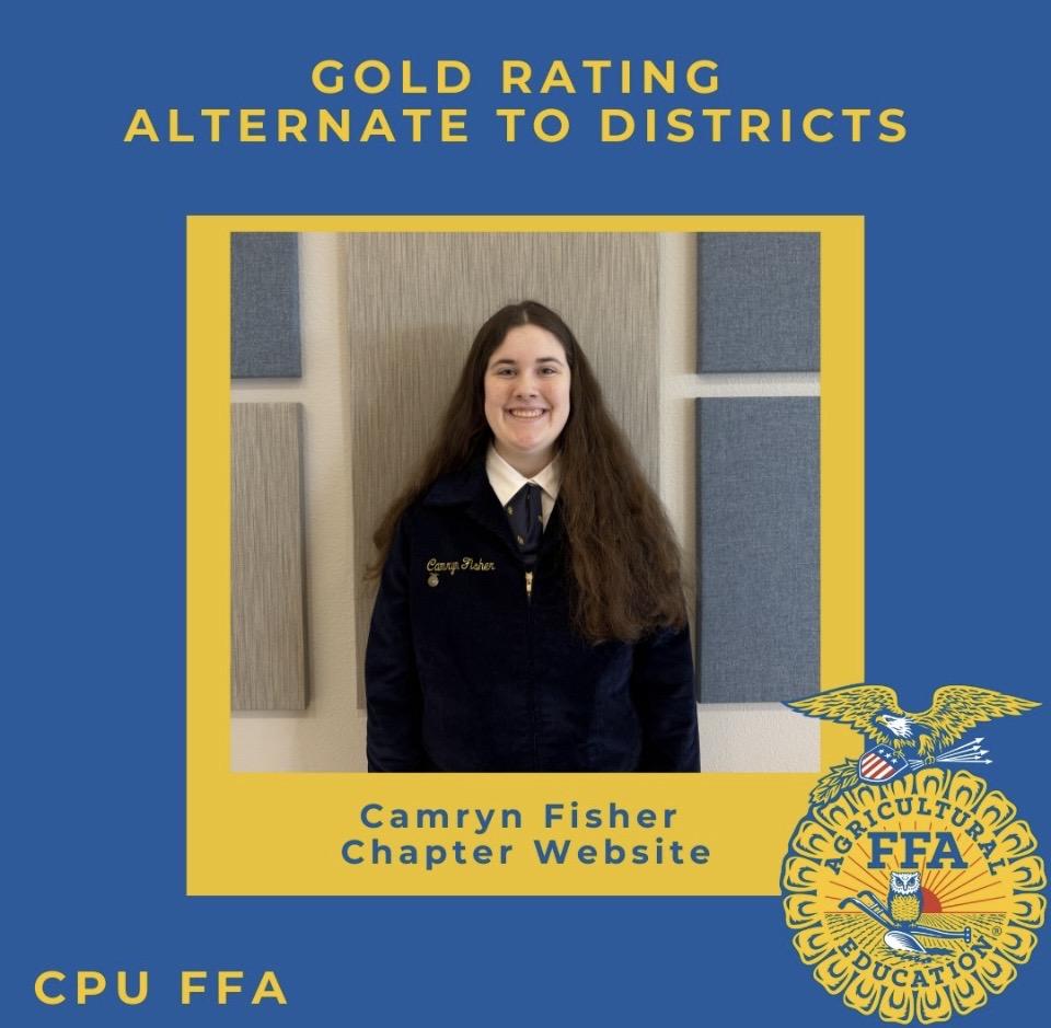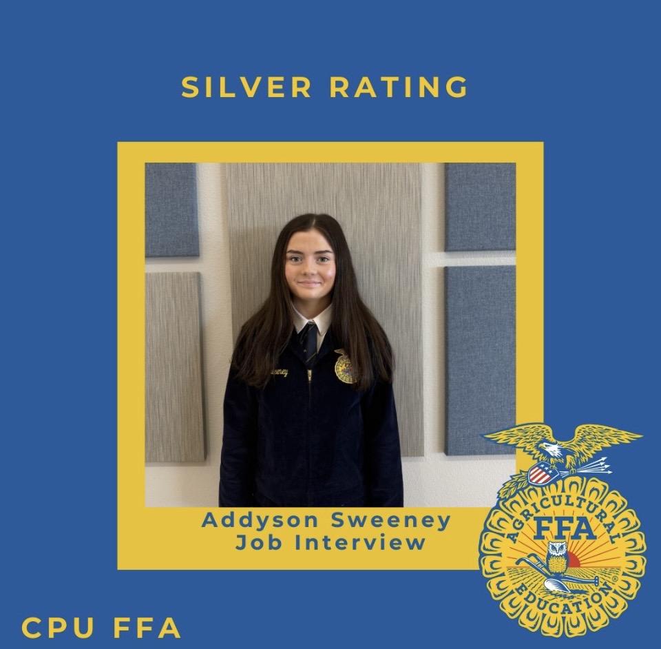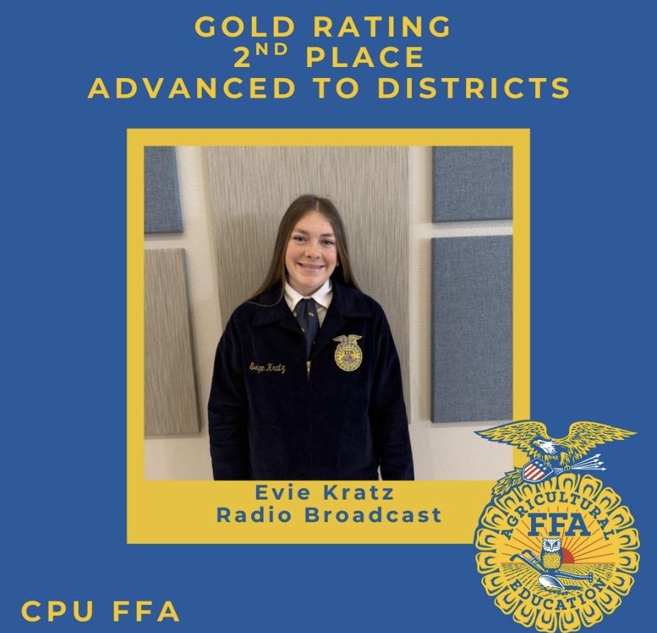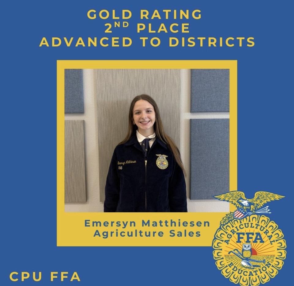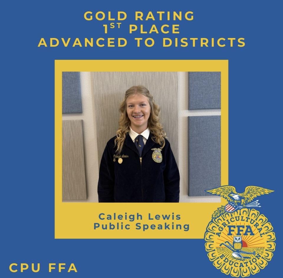 In individual events, Emersyn Mathieson received a gold rating in Ag Sales and secured an advancement to districts. Evelynn Kratz also received gold in her Radio Broadcast and will advance to districts. Caleigh Lewis placed 1st overall in Public Speaking, highlighting her incredible public speaking talent. Addyson Sweeney demonstrated her interview skills and received a silver rating in Job Interview. Camryn Fisher took on the challenge and presented the chapter website and received gold. She is also an alternate for districts.