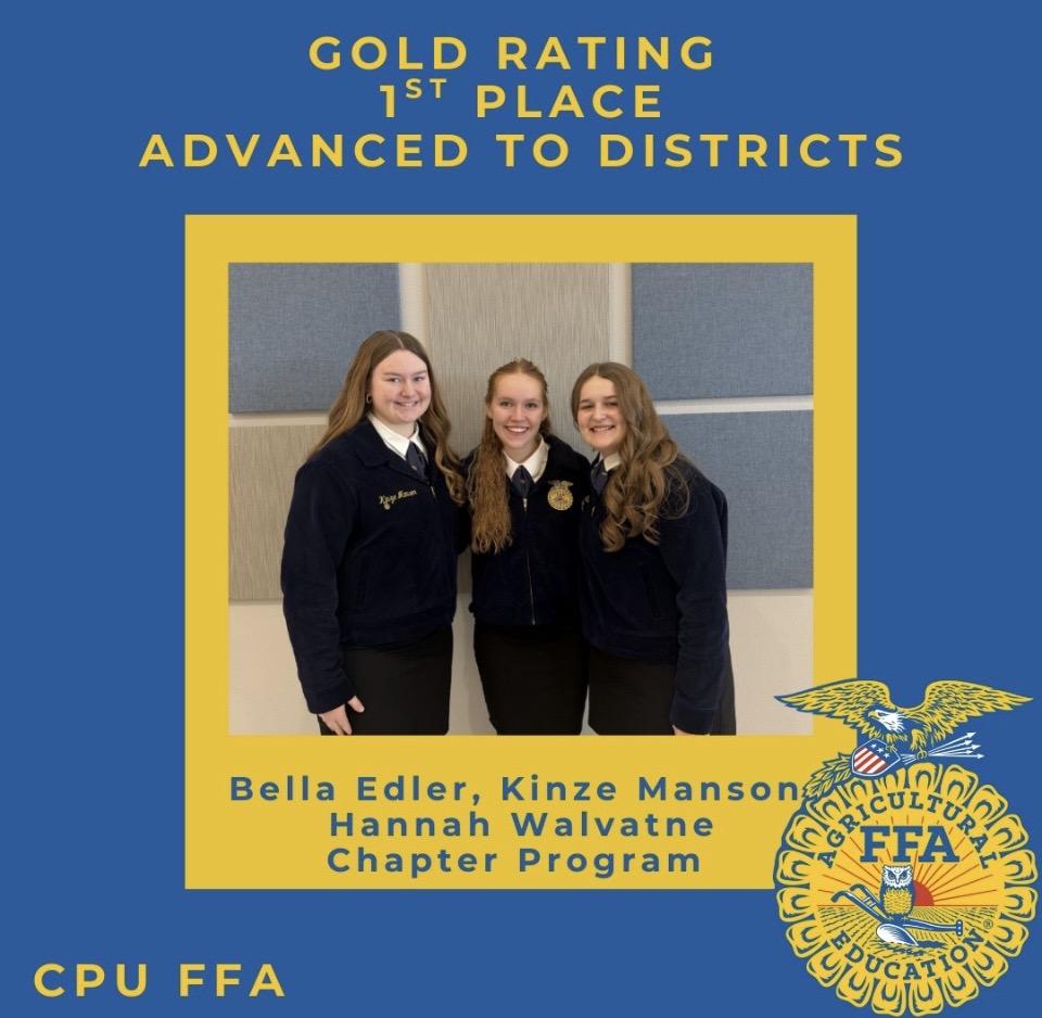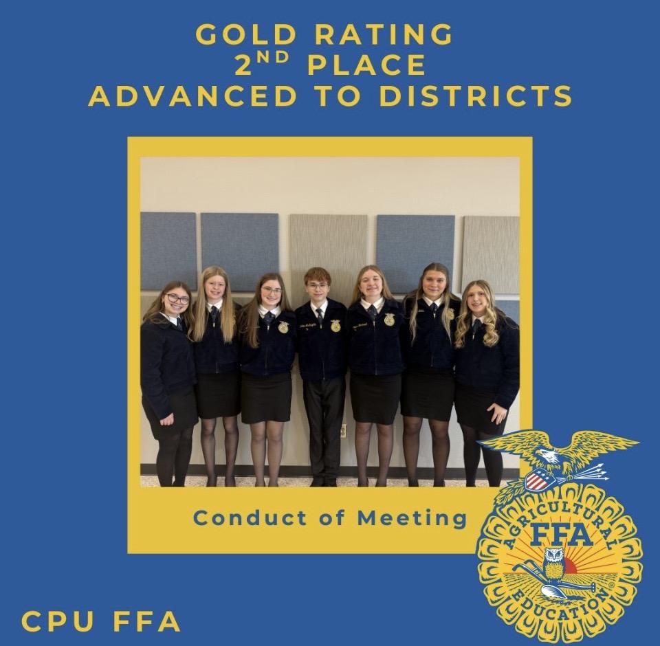 The Center Point-Urbana FFA chapter had an outstanding day at sub-districts. Beginning with teams, Conduct of Chapter Meetings scored gold and placed 2nd overall. This team included Kolten McLaughlin, Kyla Russler, Brynne Hite, Tabitha Letts, Sophia Blackwell, Audrey Seiler, and Emily Cue. Bella Edler, Kinze Manson, and Hannah Walvatne competed in Chapter Program of Activities and received gold for their amazing presentation, demonstrating their deep knowledge of the chapter and events.