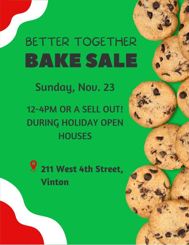 From 12-4:00 p.m. (or until everything is sold out!) on Sunday, November 23, 2025, there will be a bake sale at Better Together at 211 West 4th St. in downtown Vinton. Available at the sale will ... Join Santa for Cookies and Cocoa this Saturday at the Depot