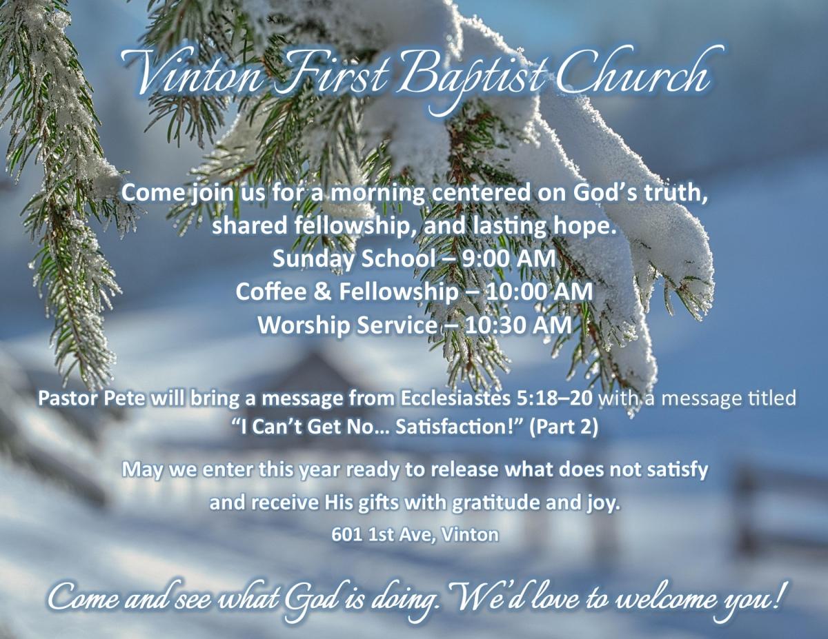 Vinton First Baptist ChurchCome join us for a morning centered on God’s truth, shared fellowship, and lasting hope.Sunday School – 9:00 AMCoffee & Fellowship – 10:00 AMWorship Service – 10... Mass Time Changes effective January 1, 2026
