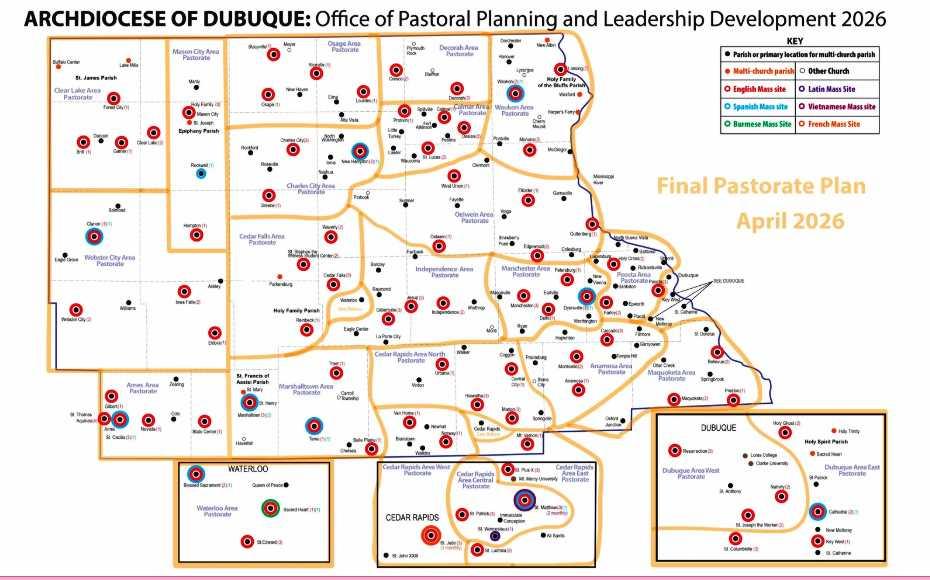 The Archdiocese of Dubuque announced its plan to reorganize 160 parishes across Iowa into 24 pastorates beginning July 14, 2026. This yearlong “Journey in Faith” is aimed at strengthening evangelization, leadership formation and pastoral planning.